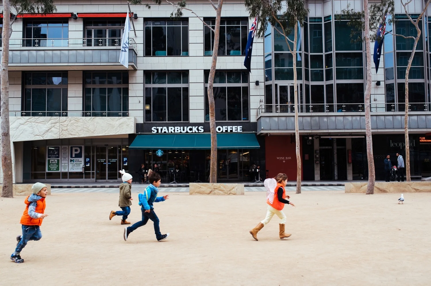 In the black and white image of the boy kicking the ball, I saw the man walking down the road to the right. I moved into a position that placed the wall in the centre of the frame and waited until the musician was in the position I wanted. Similarly with the children running in front of Starbucks in Melbourne. I saw them take off from their family to my left. Noticing that the static geometry of the building behind would add interest as they ran by, I placed the sandy-coloured foreground to fill 1/3 of the frame. And then waited for them to enter the scene, firing off a few shots. I also intentionally aligned the tree to completely block the 'C' in coffee. A large depth of field ensured that the foreground and background were both in focus.