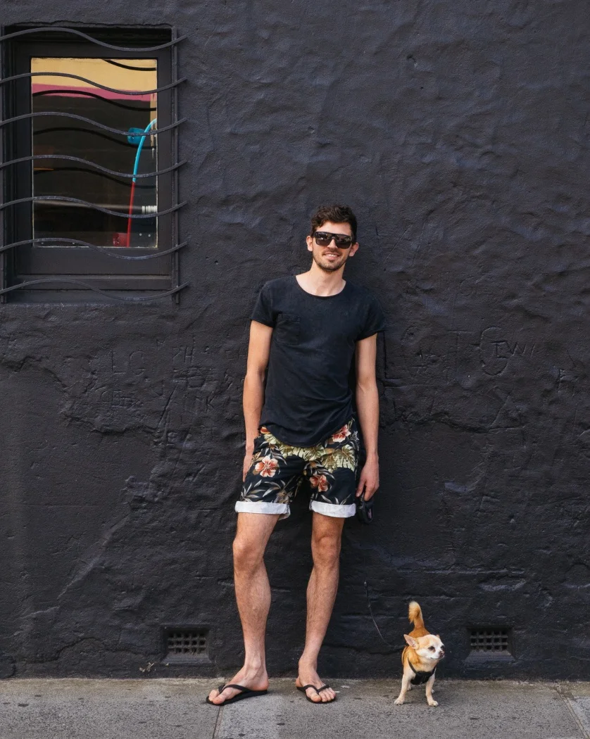 In the shot of the guy in his shorts against the grey wall with his dog, I had already found the background before he came along. I waited for the right person to walk by and asked if he would let me take his portrait. Generally a good way to make the approach is to smile, introduce yourself and compliment your subject on whatever it was that drew your attention to them in the first place. I think I said to this guy that I had found this cool background for a shot and I think he and his dog would be perfect subjects for it.
